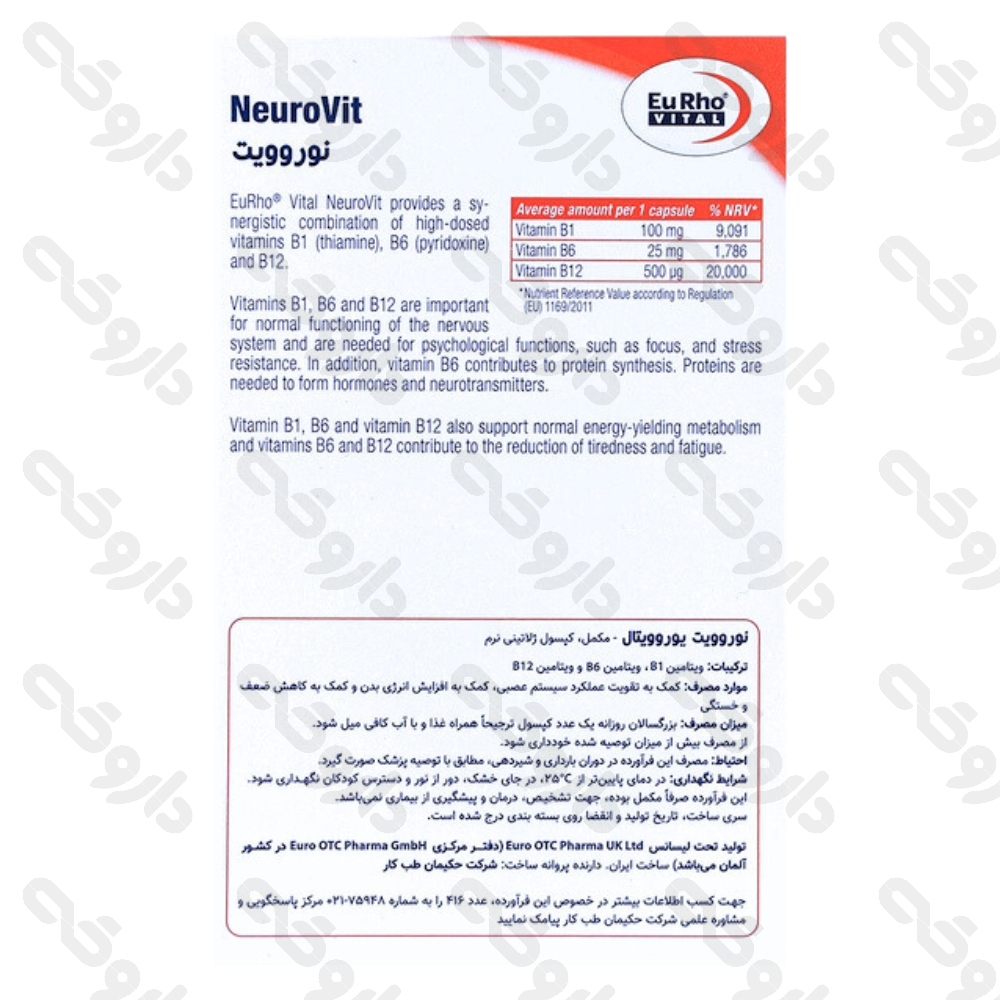 کپسول نوروویت یوروویتال با ترکیبی ویژه از ویتامینهای گروه B شامل B۱، B۶ و B۱۲ به تقویت و حفظ سلامت سیستم عصبی کمک میکند. تیامین (B۱) عملکرد عصبی و تولید انرژی مغز را بهبود میبخشد، پیریدوکسین (B۶) در ساخت انتقالدهندههای عصبی و کاهش خستگی عصبی نقش دارد و کوبالامین (B۱۲) از غلاف میلین اعصاب محافظت کرده و حافظه، تمرکز و انرژی بدن را تقویت میکند. مصرف منظم این کپسول میتواند به کاهش ضعف و خستگی، افزایش توان جسمی و ذهنی و حفظ شادابی و نشاط روزانه کمک کرده و عملکرد طبیعی اعصاب و مغز را بهینه کند.