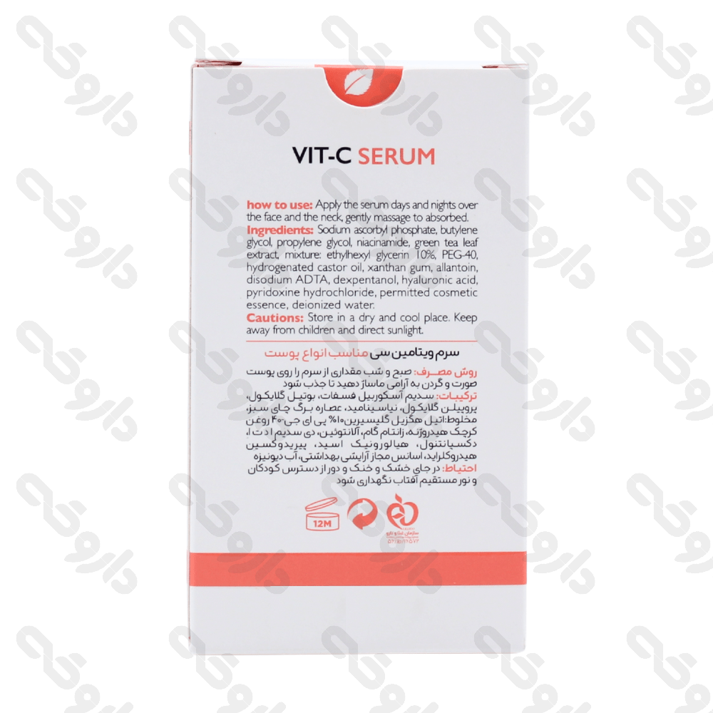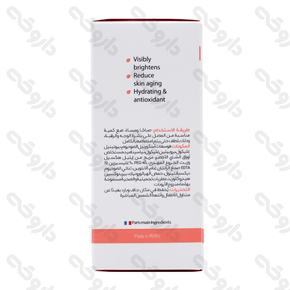 حاوی ویتامین C پایدار: با بهرهگیری از مشتقات پایدار و مؤثر ویتامین سی، این سرم روشنکنندگی پوست را بدون تحریک فراهم میکند.